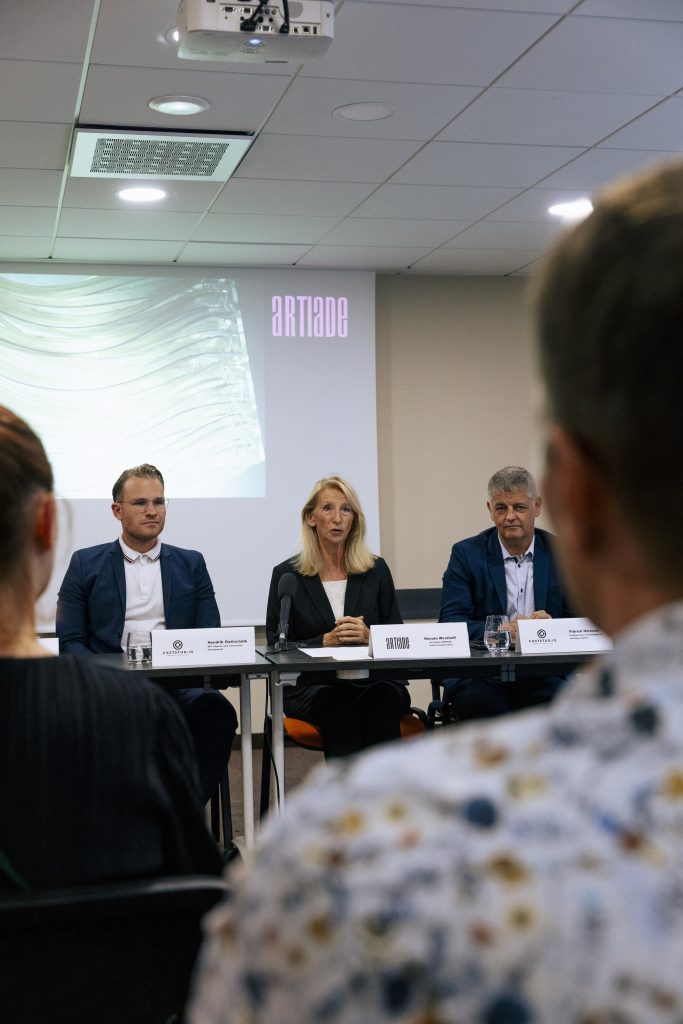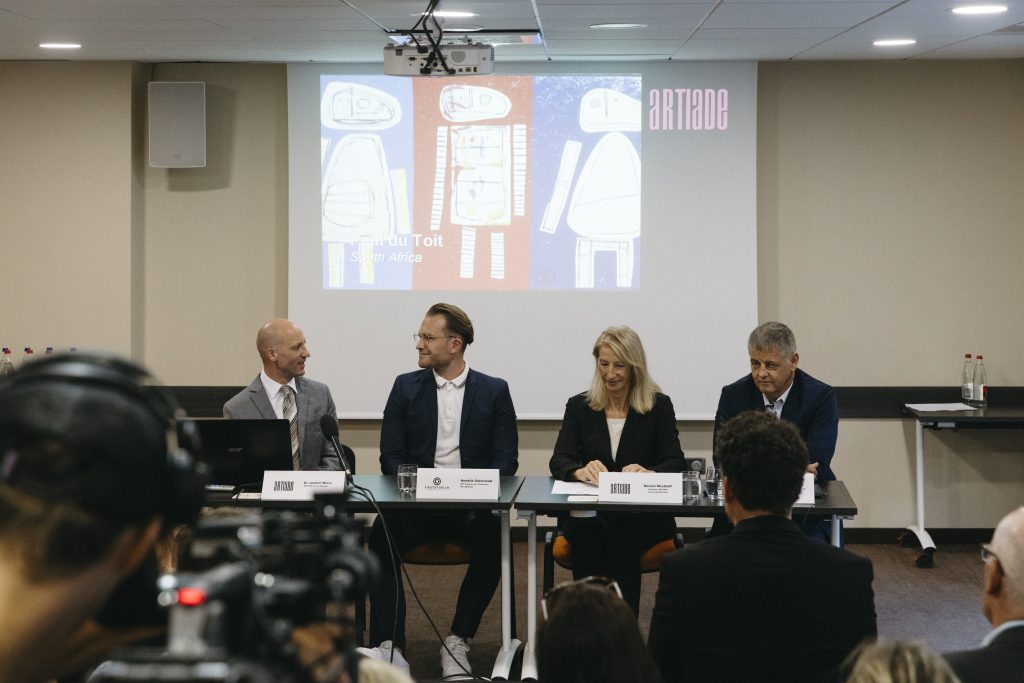 This article provides a video and a series of press conference photos featuring members from HoGA Capital and the ARTIADE-Olympics of Art. The press conference took place at the Airport Complex in Boltzheim/Basel on September 12, 2023.